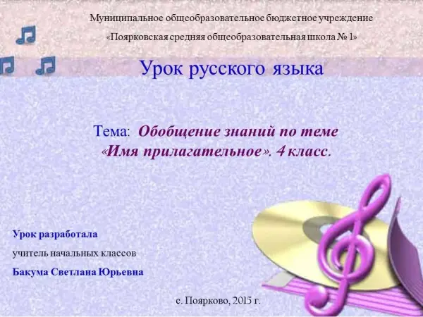 Урок построен в виде игры «Угадай мелодию». Учащиеся прослушивают фрагмент песни, угадывают ее название и выполняют задания, связанные с знаниями по теме «Имя прилагательное». В ходе урока предусмотрена индивидуальная, парная и групповая работа.