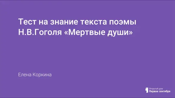 Представлен тест на знание текста поэмы Н.В.Гоголя «Мертвые души».