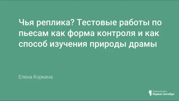 Тестовые задания, объединяемые названием «ЧЬЯ РЕПЛИКА?», кроме проверки знания теста пьесы, призваны наглядно показать учащимся все эти особенные свойства драматического диалога.