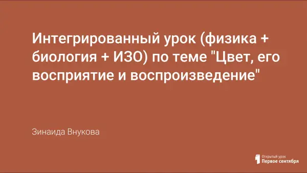 Урок физики по теме «Цвет, его восприятие и воспроизведение» расширяет рамки курса физики и включает элементы биологии и психологии. Это позволяет полнее осветить следующие вопросы: особенности органов зрения человека; происхождение поверхностного цвета предмета; психология восприятия цвета и индивидуальность восприятия; художественные приемы создания образа предмета; современная цветная индустрия.