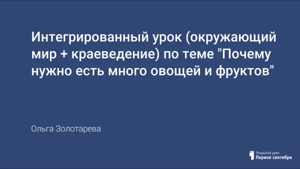 Интегрированные уроки нравятся детям, вызывают у них интерес к познанию, дают им много нового, полезного, в них содержится большой эмоциональный заряд. Эти уроки способствуют глубокому проникновению учащихся в мир красок и звуков, обогащают словарный запас, развивают эстетический вкус, способствуют формированию целостной картины мира, пониманию связей между явлениями в природе, обществе, развитию познавательного интереса. Представлен урок, на котором учащиеся узнают, почему нужно есть много овощей и фруктов, их влияние на жизнедеятельность человека.