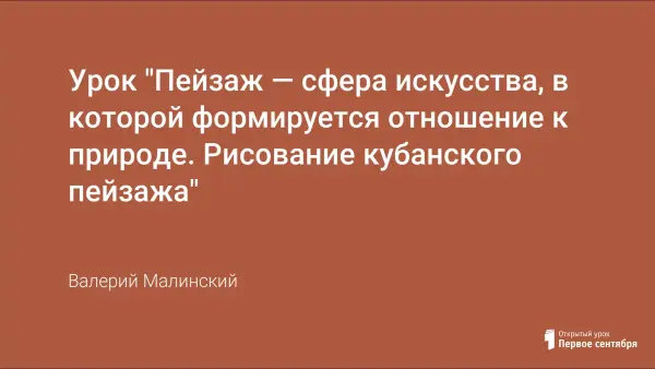 Урок «Пейзаж - сфера искусства, в котором формируется отношение к природе. Рисование кубанского пейзажа» имеет две основные цели – обучающую и воспитательную. Обучающая цель – усвоить основные приёмы работы над пейзажем. Воспитательная цель – формирование патриотического чувства у подростков через творения кубанских поэтов, художников, музыкантов, которые создают мощный эмоциональный настрой на тему, помогают, увидеть красоту родной природы, облегчают выбор объектов природы для творческой работы школьников.