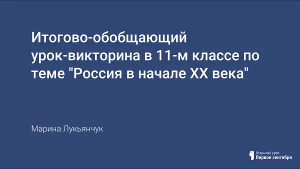 Урок проводится как заключительный после изучения темы "Россия в первой четверти XX века". В основе урока лежит телевизионная программа "Своя игра". Данная форма урока позволяет привлечь учащихся к подготовке викторины, используя их знания по информационным технологиям, а также к работе с дополнительными историческими источниками. Для составления презентации школьники предлагают категории вопросов, участвуют в их подборе, находят иллюстрации и портреты по данной тематике. Данный вид деятельности делает учащихся соавторами урока.