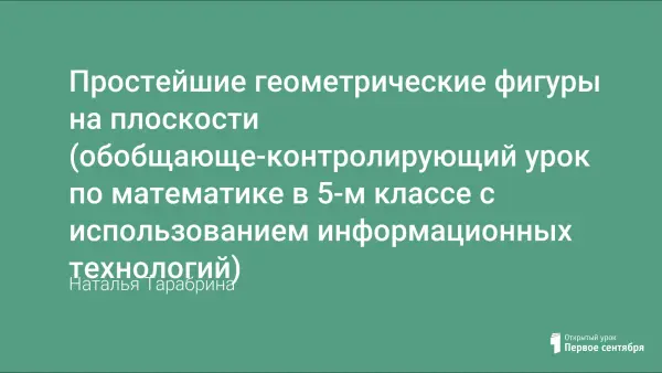 На уроке обобщаются знания учащихся о простейших геометрических фигурах на плоскости из школьного курса математики 5-го класса. Для проведения урока необходим кабинет, оборудованный современными компьютерами, и цифровой проектор с демонстрационным экраном. В ходе урока используются мультимедиа-презентация, составленная в PowerPoint, тесты и электронный справочник, созданные при помощи программы Access. В качестве раздаточного материала применяются "Рабочие листы ученика" (в которых школьники фиксируют различные этапы своей работы), выполненные в программе Word.