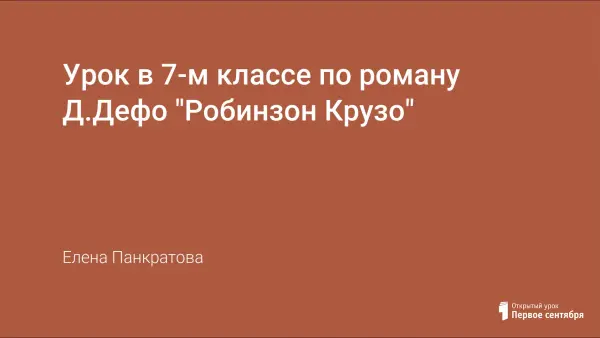 Ученики знакомятся с жизнью писателя, историей создания книги, анализируют образ главного героя. Воспитательное значение урока в том, что акцентируется внимание на способности человека выжить в экстремальной ситуации благодаря труду. Элемент интеграции проявляется в активном использовании знания учащимися английского языка.
