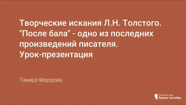 Урок-презентация представляет собой вводное занятие при изучении творчества Л.Н. Толстого в 8-м классе, включает в себя задания проблемного и творческого характера (эвристические вопросы), словарную работу, элементы театрализации, составление сводной таблицы. Занятие составлено и проведено с использованием информационных технологий, поэтому обладает достаточной информационной нагрузкой и великолепной наглядностью.