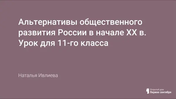 Урок по теме "Альтернативы общественного развития России в начале XX в." проводится в соответствии с программой по курсу истории России и является завершающим в теме. В ходе урока учащиеся должны обобщить ранее полученные знания и прийти к выводу: исторический процесс многовариантен, и выбор того или иного пути развития зависит от множества факторов и конкретной исторической ситуации.
