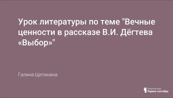 Урок литературы по теме «Вечные ценности в рассказе В.И. Дёгтева «Выбор» построен на основе анализа рассказа «Выбор», раздел «Современная литература». Форма проведения урока – урок-дискуссия с элементами стилистического анализа произведения. На уроке используется медиапрезентация.