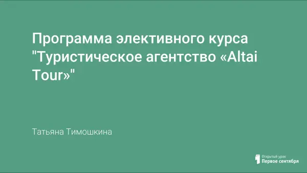 Программа элективного курса «Туристическое агентство «ALTAI TOUR» разработана для учащихся 9-х классов, изучающих английский язык и желающих познакомиться с профессией гида в туристическом бизнесе.
