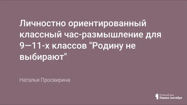 Представлен конспект личностно ориентированного классного часа. Разработка адресована классным руководителям и учащимся старших классов. Даёт возможность поразмышлять, проанализировать, понять и осознать, с чего начинается Родина, что такое патриотизм, кого сегодня можно назвать патриотом, что нужно человеку, чтобы стать личностью, гражданином, каков путь к реальному обретению Родины. Способствует воспитанию патриотических чувств детей, доброты, взаимопонимания, содействует формированию представления о долге, мужестве, героизме.
