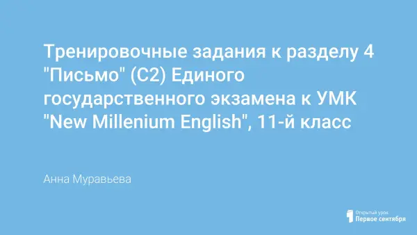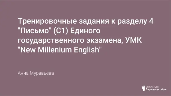 Учебник “New Millennium English” для 10-го класса (О.Л. Гроза и др. – Обнинск: Титул) содержит большое количество упражнений, направленных на формирование навыков письменной речи, однако их формат несколько отличается от формата ЕГЭ. Предлагаемый вниманию коллег материал содержит подборку тренировочных заданий формата ЕГЭ, соответствующих разделам учебника. Надеюсь, они могут быть полезны учителям, работающим по УМК “New Millennium English”, при подготовке учащихся к экзамену.