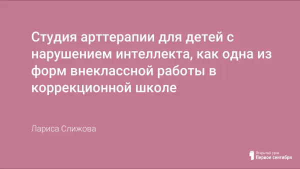 Студия арт-терапии для детей с нарушением интеллекта – это одна из форм внеклассной работы в специальных коррекционных школах 8 вида, которая имеет немаловажное значение для учащихся, их родителей и педагогов. Студия находится в специальном кабинете оборудована различными экспонатами, художественными материалами, техническими средствами, мебелью и соответствующей обстановкой. Студию посещают учащиеся школы разного возраста и уровня развития. Все дети находятся под наблюдением психолога и педагога со специальным образованием. Составлена комплексная программа, которая включает в себя разделы по арт-терапии, декоративно-прикладному искусству, с блоком занятий национально-регионального компонента.