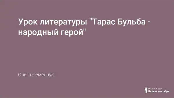 Основной целью заключительного урока по произведению Н.В.Гоголя "Тарас Бульба" является развитие умения находить в художественном тексте материал, выделять художественные средства, необходимые для характеристики персонажа, и через них показывать отношение автора к своему герою. Для наглядности используются иллюстрации художника Е.Кибрика и репродукция картины И.Репина "Запорожцы пишут письмо турецкому султану".