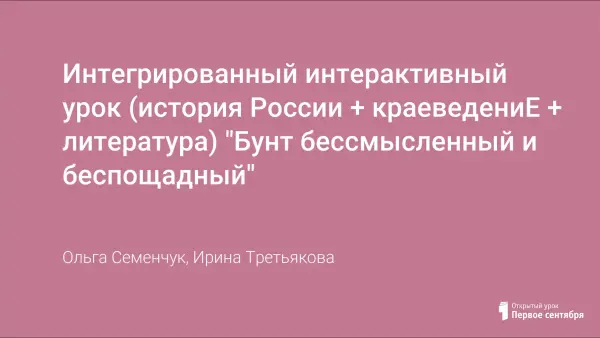 Урок по истории России, краеведению и литературе «Бунт бессмысленный и беспощадный» (крестьянская война под предводительством Е.И. Пугачёва и её отражение в произведениях А.С. Пушкина и А.С. Маркова.) проводится по итогам изучения темы: «Социально- экономическое положение России во второй половине XVIII века».