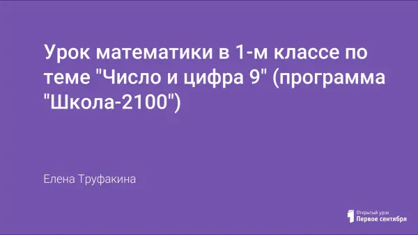 Урок математики в 1-м классе по теме "Число и цифра 9", программа "Школа-2100". Представлена разработка конспекта урока введения нового знания. Урок составлен по учебнику Л.Г.Петерсон и посвящен формированию понятия числа 9. Структура урока способствует формированию коммуникативной компетенции через организацию работы в группах.