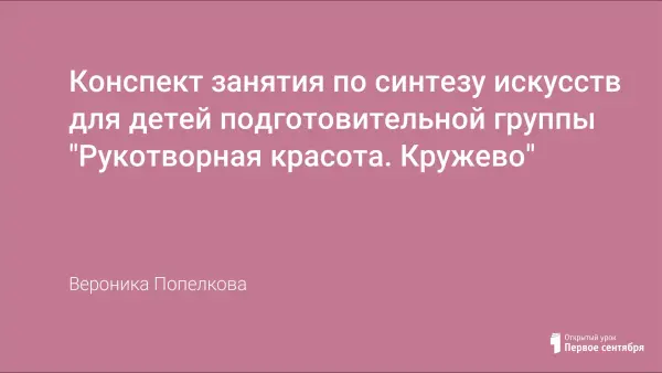 На протяжении многих лет наше дошкольное учреждение в своей работе использует парциальную программу О.А. Куревиной "Синтез искусств в эстетическом воспитании дошкольников". Основная цель занятия "Рукотворная красота. Кружево" — понимание роли человека-творца, человека-труженика.