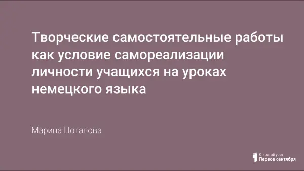 Творческие самостоятельные работы являются важнейшим условием самореализации личности учащихся на уроках немецкого языка. Они развивают творческие способности учеников, воспитывают активную творческую личность на основе создания максимально благоприятных условий для развития и формирования творческих способностей каждого, выявляют и используют в учебной деятельности индивидуальные особенности учащихся, повышают интерес и качество обученности по немецкому языку.