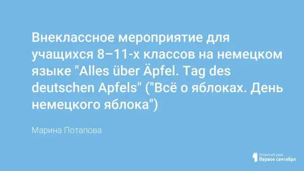 Мероприятие способствует приобретению новой страноведческой, культуроведческой и научной информации о яблоках; позволяет проверить полученные знания с помощью тематической викторины; прививает любовь к правильному питанию и здоровому образу жизни; знакомит с современными традициями Германии. Конкурс поделок из яблок позволяет реализовать творческий потенциал учащихся. Мероприятие направлено на мотивацию изучения немецкого языка.
