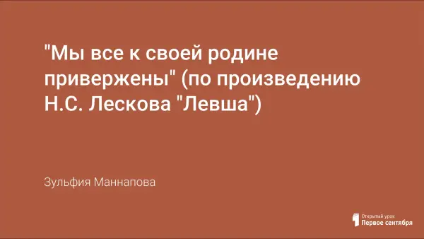 Главным героем урока по предложенной теме является Левша. Сопоставительная характеристика с другими действующими персонажами рассказа - государями Александром и Николаем, атаманом Платовым - подготавливает оценку тульского мастера. В центре внимания оказывается поездка русского умельца в Англию, которого не соблазнила заморская жизнь. Соотнеся поступки простого человека и "отцов Отечества", учащиеся приходят к выводу о том, чем им дорог родной край.