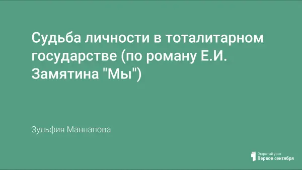 Данный урок с использованием презентации является итогом размышлений одиннадцатиклассников над очень важными вопросами: "Что такое личность? Человек – это личность или "нумер"? Какова роль тоталитарного государства в жизни общества?.." Занятие построено на анализе эпизодов романа Е.И. Замятина.
