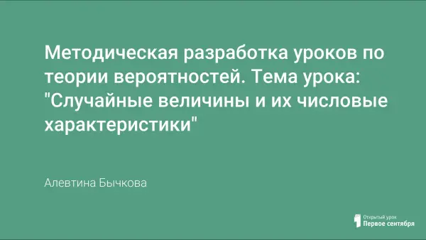 Методическая разработка урока по теории вероятностей в 11-м физико-математическом классе с целью познакомить учащихся с основными числовыми характеристиками случайных величин: математическим ожиданием, дисперсией, средним квадратическим отклонением; отработать навыки нахождения этих характеристик для небольших наборов дискретных случайных величин; рассмотреть свойства математического ожидания, дисперсии.