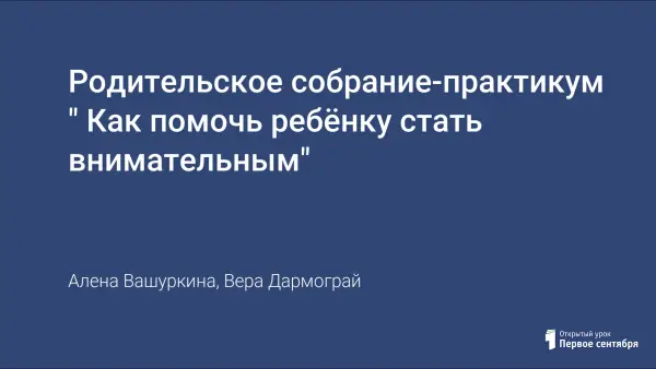 На родительском собрании-практикуме педагог и психолог знакомят детей и их родителей с психологическим понятием «внимание», расширяют их представления о различных способах поддержания и увеличения его объема, объясняют необходимость развития внимания для успешного обучения в школе, знакомят в ходе занятия с упражнениями и играми по развитию внимания для младших школьников.