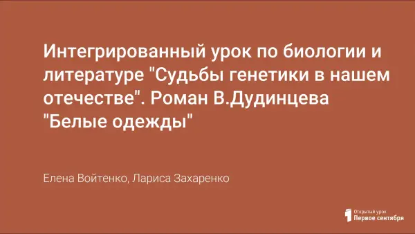 Интеграция учебных предметов – новация, получившая широкое распространение. Под интегрированным обучением понимается процесс создания новых дидактических эквивалентов, отражающих тенденции интеграции современной науки. Интегрированное знание является информационно более емким и направлено на интеллектуальное развитие личности. В интегрированном содержании заключено больше возможностей для формирования альтернативного мышления учащихся. Развитию учащихся способствует интегрированный урок биологии и литературы «Судьбы генетики в нашем Отечестве. Роман В.Дудинцева «Белые одежды».