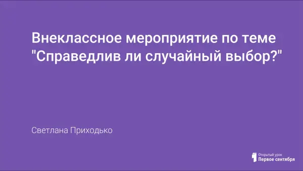 Внеклассное мероприятие «Справедлив ли случайный выбор?..» учит принимать обоснованные решения в ситуациях со случайным исходом, знакомит с математическими средствами убедительной аргументации. Мероприятие рассчитано на учащихся, владеющих элементами статистики и теорией вероятностей на уровне 8-го класса.