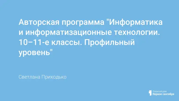 Программа по информатике и ИКТ, 10–11-й классы. Профильный уровень (линия математика – информатика). Для общеобразовательных школ, гимназий, лицеев. Приложения содержат календарно-тематическое планирование, структуру и оценивание контрольно-измерительных материалов.