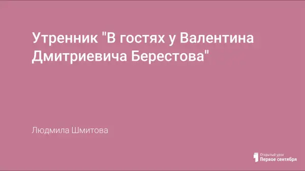 Цель: ввести детей в мир произведений замечательного поэта Валентина Дмитриевича Берестова. Замедленность процесса чтения, отсутствие интереса к чтению приводит к тому, что процессы интеллектуальной деятельности тоже замедляются. Желание читать, стойкий интерес к чтению формируется в семье и основа его – привычка к чтению.