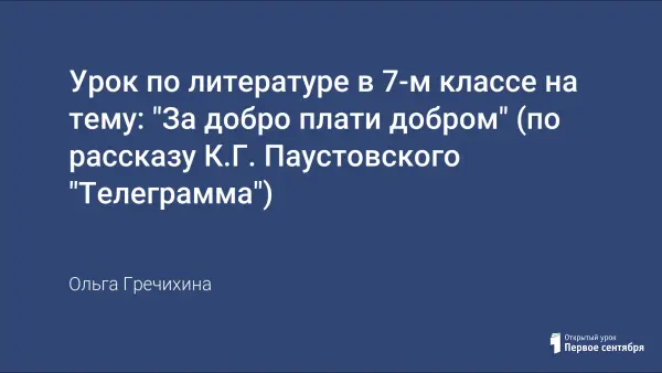 Содержание урока построено на анализе рассказа К.Г. Паустовского "Телеграмма", учит анализировать текст, находить в произведении художественные средства и приемы (эпитеты, олицетворения, метафоры); развивает правильную грамотную речь, память, мышление; воспитывает любовь, доброту, милосердие, отзывчивость к людям, к родителям. Материал может быть использован для урока внеклассного чтения.