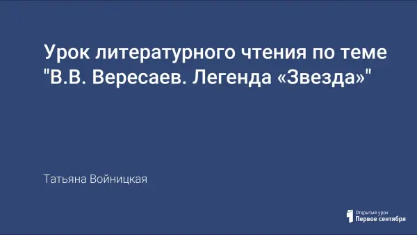 План-конспект открытого урок литературного чтения в 4-м классе (программа "XXI век"). Тема урока: В.В. Вересаев "Легенда", "Звезда". Урок разработан по методам технологии развития критического мышления. Данный урок вырабатывает правильный тип читательской деятельности - учит вдумчивому чтению, понимать чужую мысль, сопереживать и соразмышлять с автором произведения. Урок был представлен на районном конкурсе "Учитель года – 2007".