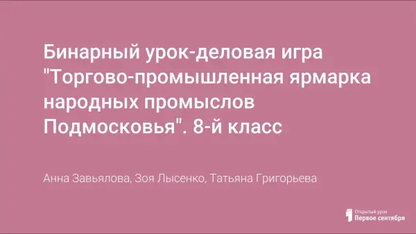 В процессе ролевой игры учащиеся знакомят представителей иностранных торговых фирм с историей предприятия и рекламируют свою продукцию. Представлены товары народных промыслов: Гжели, Жостово, Павлово-Посадской мануфактуры и Богородской игрушки. Результатом игры является подписание договора продажи товаров на выставке-ярмарке.
