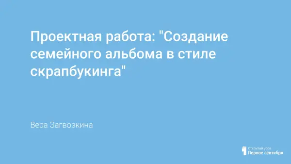 Цель работы: дать описание процесса создания фотоальбома в технике скрапбукинг. В теоретической части рассмотрена история возникновения, техники и стили скрапбукинга. Практическая часть посвящена возможным вариантам создания альбомов, их оценка, также технология изготовления фотоальбома в технике скрапбукинг. Богатый выбор материалов и разнообразие техник позволяет воплощать в жизнь самые необычные творческие фантазии, при этом создавая уникальную семейную летопись, которая сохранит память о сегодняшнем дне во многих поколениях.