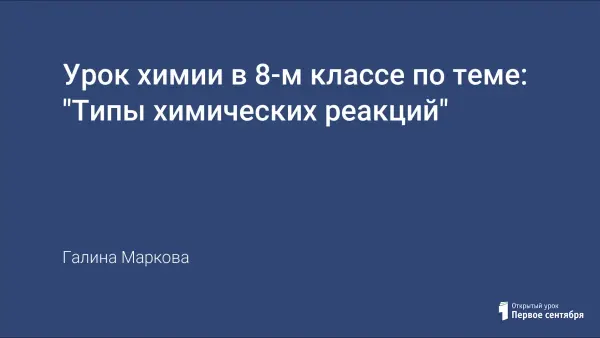 В течение многих лет в 8-м классе, независимо от того, по какому учебнику мы занимаемся, считаем целесообразным изучение темы "Типы химических реакций" начинать сразу после знакомства с уравнениями химических реакций. Это позволяет больше времени уделить формированию умений учащихся составлять УХР, расставлять коэффициенты, а также при дальнейшем изучении курса химии 8-го класса закреплять знания учащихся о способах классификации химических реакций. Предлагаем вариант урока по данной теме. Все этапы урока, кроме домашнего задания, можно строить независимо от того, по какому учебнику вы работаете.