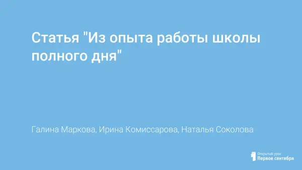 Материал представлен из опыта работы школы полного дня – современной модели учебного заведения. Наша школа открыта для учащихся целый день и обеспечивает в комплексе тесное единство воспитания и организации общеобразовательной, эстетической, спортивной деятельности в соответствии с учебными планами и индивидуальными интересами школьников.