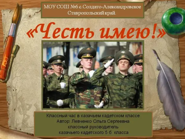 Классный час проводится после присяги в казачьем кадетском классе. Цель классного часа: формирование у учащихся таких качеств, как патриотизм, любовь и уважение к Отечеству, гражданственность, чувство долга; развивать положительное отношение к военной службе; воспитывать уважение к Вооруженным силам России, военнослужащим; пробуждать готовность стать защитником Отечества, формировать представления учащихся о духовно- нравственном смысле понятия «честь», «патриот».