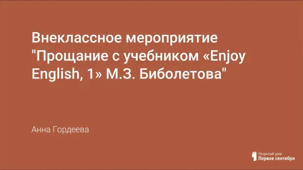 Предлагаемое мною внеклассное мероприятие – Прощание с учебником “Enjoy English 1. М.З. Биболетова” – целесообразно не только как повторение изученного и закрепление его в игровой форме через задания, подобранные с учетом возрастных особенностей обучаемых, но и развитие их творческих способностей, сплочение школьного коллектива и родителей, укрепление эмоциональных связей между родителями и детьми, развитие организованности.