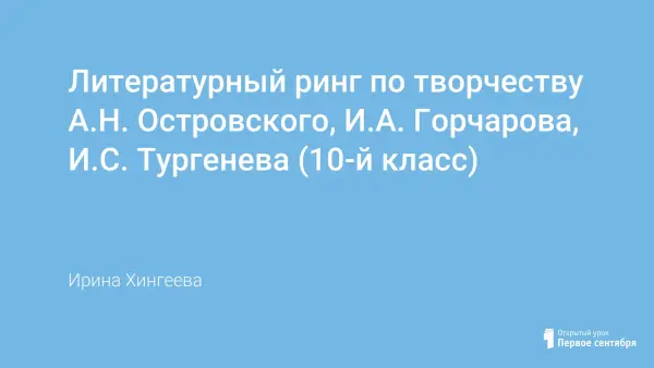"Литературный ринг" рассчитан на учащихся 10-х классов. Принимают участие 5 команд по 6 человек. При составлении команд учитывается интеллектуальное равенство учащихся. Конкурсы проводятся по заданиям, предполагающим знания и логику. Сценарий составлен из программного материала по литературе по творчеству А.Н. Островского, И.А. Гончарова, И.С. Тургенева. Ведут программу двое ведущих из учащихся.