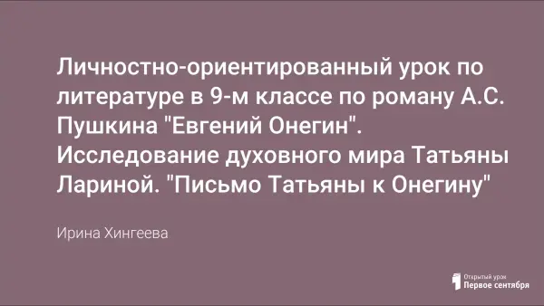 Урок составлен по технологии личностно-ориентированного обучения. Главная цель учащихся – исследуя духовный мир Татьяны Лариной, найти значение понятия «духовность». Получая новые знания, дети смогут научиться различным способам деятельности: исследованию, анализу, обобщению, созданию творческого продукта.