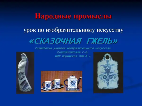 На уроке учащиеся знакомятся с гжельской керамикой, разнообразием её посудных форм, особенностями росписи. У детей формируются навыки составления декоративной композиции, работы открытым мазком без предварительного рисунка, соблюдая цветовую гамму.
