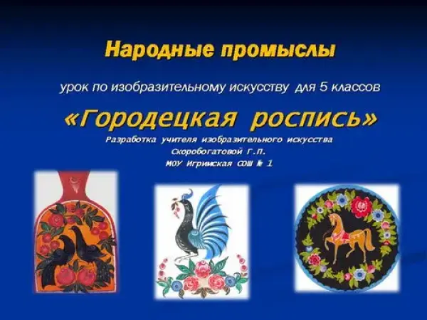 Использование мультимедийного оборудования на уроке даёт возможность всесторонне показать народный промысел "Городец" учащимся и поэтапно с помощью презентации выполнить элементы росписи, используя раздаточный материал. Урок позволяет учащимся поработать над элементами росписи в заданном эмоциональном состоянии; проверить полученные знания, ответив на вопросы о промысле в конце урока.
