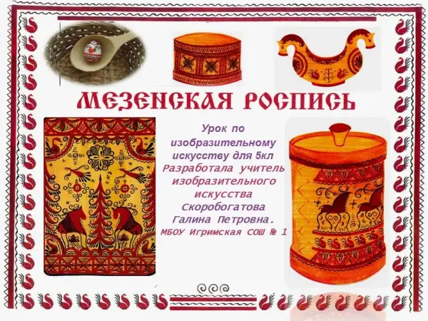 Цель урока: познакомить учащихся с народным промыслом России – мезенская роспись, сформировать навыки составления декоративной композиции, без предварительного рисунка соблюдая цветовую гамму.