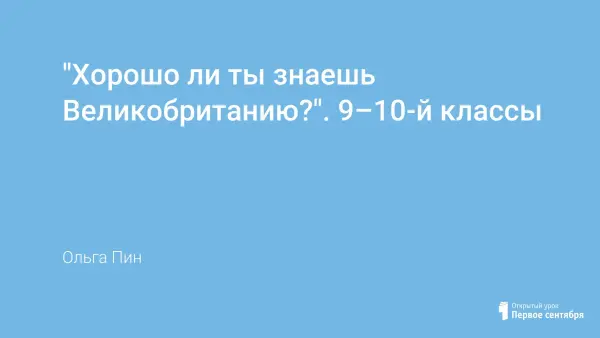 Статья представляет собой разработку внеклассного мероприятия – викторины, рассчитанной на учащихся 9–10-х классов. Викторина состоит из 6 раундов: домашнее задание (рассказ об одной из частей Великобритании), известные люди (узнать по фотографии и рассказать как можно больше), даты и числа (что означает каждая дата в истории Великобритании), достопримечательности (узнать по фото), конкурс капитанов, праздники (рассказать об одном из традиционных праздников) и блиц-опрос.