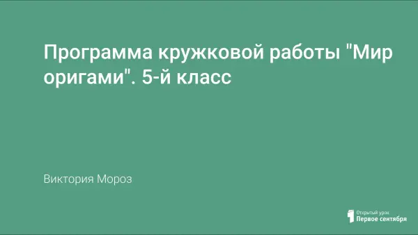 Программа проведения кружковой работы «Мир оригами» предназначена для преподавания оригами в 5-м классе общеобразовательной школы в течение одного учебного года.