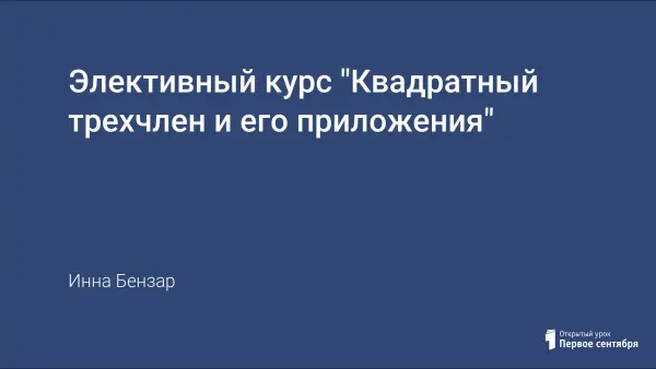 Курс предназначен для 8–9-х классов в рамках предпрофильной подготовки. Он освещает недостаточно хорошо проработанные в общем курсе школьной математики вопросы и направлен на расширение знаний, повышение уровня математической подготовки через решение более сложных задач, нестандартных приёмов решения на основе свойства квадратного трёхчлена и его графика.