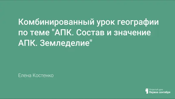 Урок знакомит учащихся с составом АПК, рассматривает взаимодействие отраслей и раскрывает их роль в хозяйстве страны, изучает особенности сельского хозяйства, учит анализировать статистические данные, карту "Агроклиматические ресурсы", чертить схему "Состав АПК".