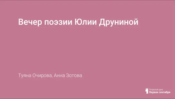 Литературный клуб "Вдохновение" представляет вашему вниманию "Вечер поэзии Юлии Друниной", который можно провести как урок по теме "Жизнь и творчество Ю.Друниной", а также как внеклассное мероприятие по предмету. Цель предлагаемого вечера — знакомство с творчеством поэтессы. Задачи: дать учащимся представление о судьбе Юлии Друниной, воспитывать чувства прекрасного. Статью можно отнести к разделу: преподавание литературы, внеклассная работа по предмету.