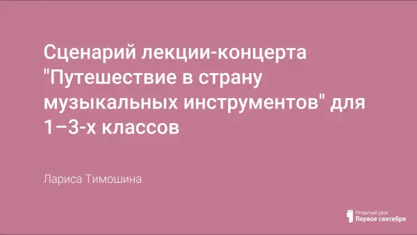 Цель лекции-концерта - приобщить детей к музыкальному искусству, расширить кругозор и воспитывать культуру слушания музыки. Лекция-концерт "Путешествие в страну музыкальных инструментов" предназначена для ознакомления учащихся 1-3-х классов с музыкальными инструментами и их историей возникновения. Важно то, что участниками концерта являются их ровесники. Текст изложен в доступной, увлекательной форме, который звучит из уст знакомых сказочных персонажей. Дети не только слушают рассказ, но и видят настоящие музыкальные инструменты.