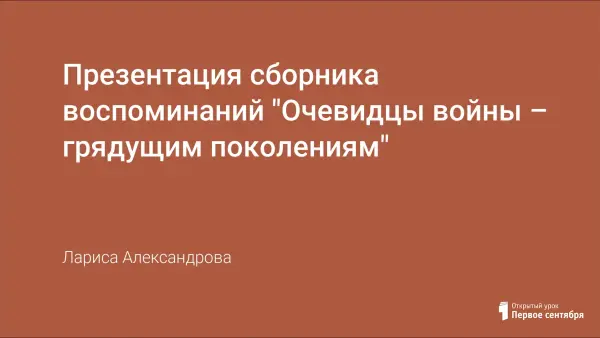 Внеклассное мероприятие «Очевидцы войны – грядущим поколениям» – это итог поисковой деятельности краеведческого центра «Берегиня» по сбору воспоминаний о Великой Отечественной войне. В презентации сборника освещены странички: ветераны войны, труженики тыла и дети войны.
